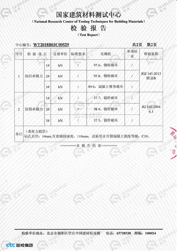 表格未列出的產(chǎn)品,請參照《JGJ145-2013混凝土結(jié)構(gòu)后錨固技術(shù)規(guī)程》按照承載力極限狀態(tài)計算方式得出相應(yīng)數(shù)據(jù),具體方案請咨詢施邦 (上海) 實業(yè)有限公司技術(shù)部