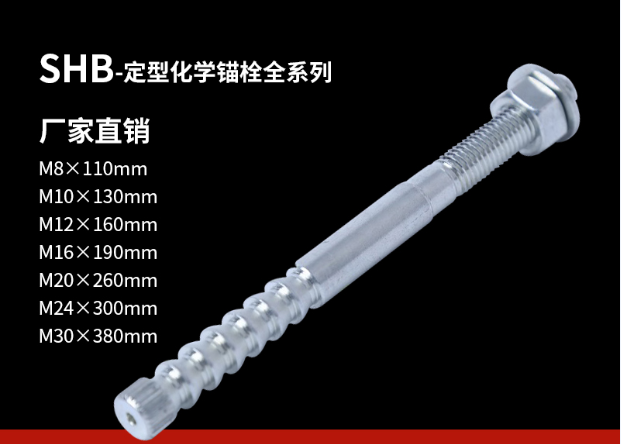 SHB-特殊倒錐形化學(xué)錨栓栓由螺桿、平墊、螺母組成,通過化學(xué)粘接劑保證錨栓與混凝土體的粘接強度,又通過倒錐體與混凝土機械鎖鍵保證連接強度。需配合施邦改性環(huán)氧注射式植筋膠使用。