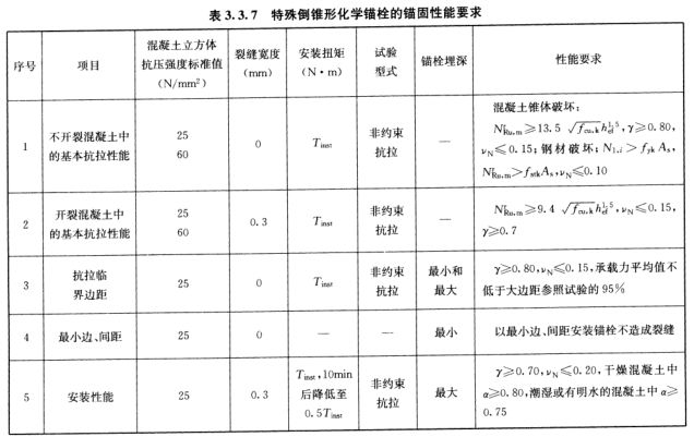 JCJ 145-2013《混凝土結(jié)構(gòu)后錨固技術(shù)規(guī)程》3.3.7-1適用于開裂混凝土的特殊倒錐形化學(xué)錨栓,應(yīng)滿足表3.3.7的錨固性能要求。JCJ 145-2013《混凝土結(jié)構(gòu)后錨固技術(shù)規(guī)程》3.3.7-2適用于不開裂混凝土的特殊倒錐形化學(xué)錨栓,應(yīng)滿足表3.3.7中第2、6項以外項目的性能要求。