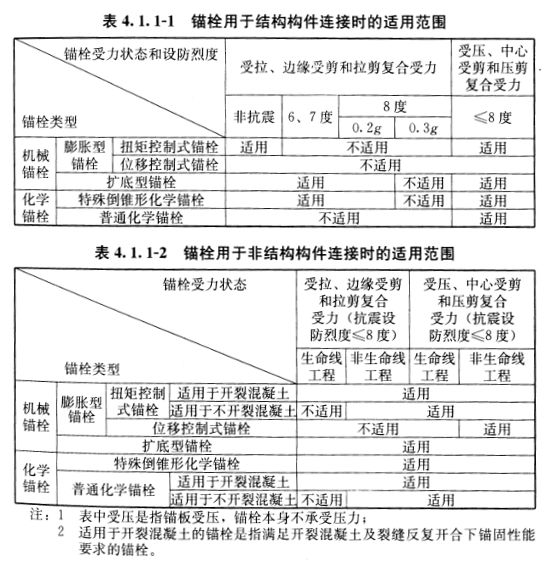 JCJ 145-2013《混凝土結(jié)構(gòu)后錨固技術(shù)規(guī)程》8.1.1后錨固技術(shù)適用于設(shè)防烈度8度及8度以下地區(qū),以鋼筋混凝土、預(yù)應(yīng)力混凝土為基材的后錨固連接,在承載結(jié)構(gòu)中采用后錨固技術(shù)時宜采用植筋;設(shè)防烈度不高于8度(0.2g)的建筑物,可采用后擴底錨栓和特殊倒錐形化學(xué)錨栓。JCJ 145-2013《混凝土結(jié)構(gòu)后錨固技術(shù)規(guī)程》4.1.1 錨栓應(yīng)按照錨栓性能、基材性狀、錨固連接的受力性質(zhì)、被連接結(jié)構(gòu)類型、抗震設(shè)防等要求選用。錨栓用于結(jié)構(gòu)構(gòu)件連接時的適用范圍應(yīng)符合表4.1.1-1的規(guī)定,用于非結(jié)構(gòu)構(gòu)件連接時的適用范圍應(yīng)符合表4.1.1-2的規(guī)定。