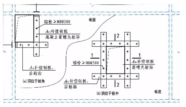 c、補償鋼板面積不得小于截斷鋼筋的等效截面面積的1.2倍。