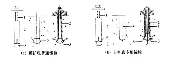 承重結(jié)構(gòu)用的機(jī)械錨栓,應(yīng)采用有鎖鍵效應(yīng)的后擴(kuò)底錨栓。通過錨孔底部擴(kuò)孔與錨栓組件之間的鎖鍵形成錨固作用的錨栓。