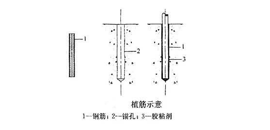 化學(xué)植筋,簡稱植筋,是我國工程界廣泛應(yīng)用的一種后錨固連接技術(shù)。將帶肋鋼筋及螺桿膠結(jié)固定于混凝土基材鉆孔中,通過粘結(jié)與鎖鍵作用,實(shí)現(xiàn)對(duì)被連接件錨固的一種組件,安全等級(jí)為一級(jí)的后錨固連接植筋時(shí)應(yīng)采用A級(jí)膠。