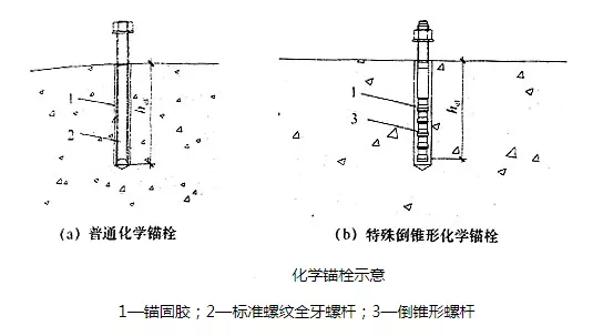 按照受力機(jī)理可分為兩種:普通化學(xué)錨栓和特殊倒錐形化學(xué)錨栓。特殊倒錐形化學(xué)錨栓,在安裝時(shí)通過錨固膠與倒錐形螺桿之間滑移可形成類似于機(jī)械錨栓的膨脹力。