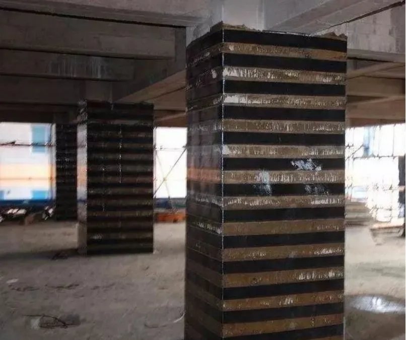 鋼筋混凝土柱(軸向受壓構件)因延性不足而進行抗震加固時,可采用環(huán)向粘貼碳纖維布形成的環(huán)向圍束作為附加箍筋,從而達到提高抗震性能的目的。采用環(huán)向圍束法進行加固時,對所加固構件有明顯的約束作用,在軸向壓力的作用下,混凝土構件處于三向受壓狀態(tài),可以較大幅度的提高混凝土受壓承載力,增強結構延性,可明顯提高結構的抗震性能。