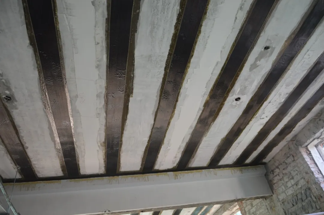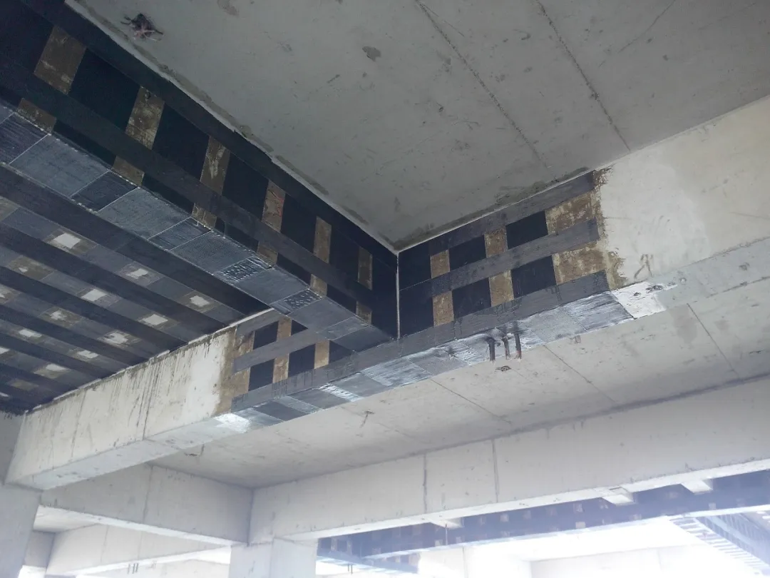 受彎構件正截面加固常見于梁、板構件,當梁、板構件使用荷載增加導致受彎承載能力不足時,可對其進行加固。可在受彎構件的受拉邊混凝土表面上粘貼纖維布進行加固,以此提高受拉區(qū)的抗拉強度,從而提高結構構件的承載能力。